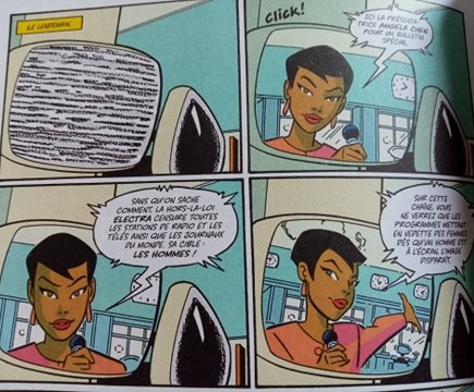 Peu de temps après, les braves gens de Metropolis remarquent que les chaînes de télé ont été sabotées : au JT, seules les éditions présentées par des femmes sont diffusées correctement ! Une grande première... Toutes les rédactions doivent donc méchamment bousculer leur mode de fonctionnement habituel, puisque généralement, seuls les hommes se retrouvent face à la caméra.